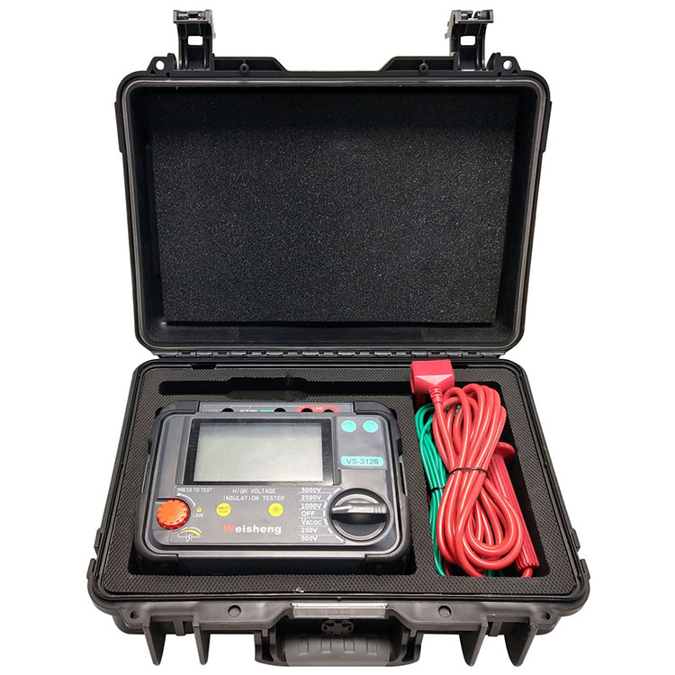 VS-3127 VS-3127Eristysvastusmittaritarjoaa mahdollisuuden suorittaa tarkkoja eristysresistanssimittauksia 15 kV testijännitteeseen asti maksimiresistanssilla 30 TΩ. Resistanssimittauksen tarkkuus on ± 5 % 1 MΩ - 3 TΩ! Sähkö- ja palveluyrityksille VS-3127 on monipuolinen testaaja joustavuuden ja tulevaisuuden varmistuskyvyn ansiosta. Weshine VS-3127 on suunniteltu toimimaan missä tahansa. Lähtönimellisjännite on enintään 7 vaihdetta (250Vï¼500Vï¼1KVï¼2,5KVï¼5KVï¼10KVï¼15KV). Max oikosulkuvirta 7mA Eristysresistanssitesti (IR), polarisaatioindeksi testiï¼PI, dielektrisen absorptiosuhteen testi (DAR). Ramppitestitila (RAMP), suodatettu vastustestitila (FR). *Kapasitanssitesti (Cap.). Jännitteenvalvontatoiminto, joka valvoo automaattisesti mitatun jännitteen jännitettä