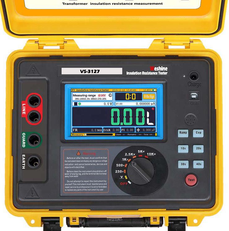 Weshine® VS-3127 on akkukäyttöinenMuuntajan polarisaatioindeksidigitaalisella ja analogisella kaarinäytöllä, suunniteltu korkeajännitteisen eristysresistanssin testaukseen kaapeleiden, pyörivien laitoskoneiden, muuntajien, kytkinlaitteiden ja teollisuussovellusten kunnossapidossa ja huollossa.
